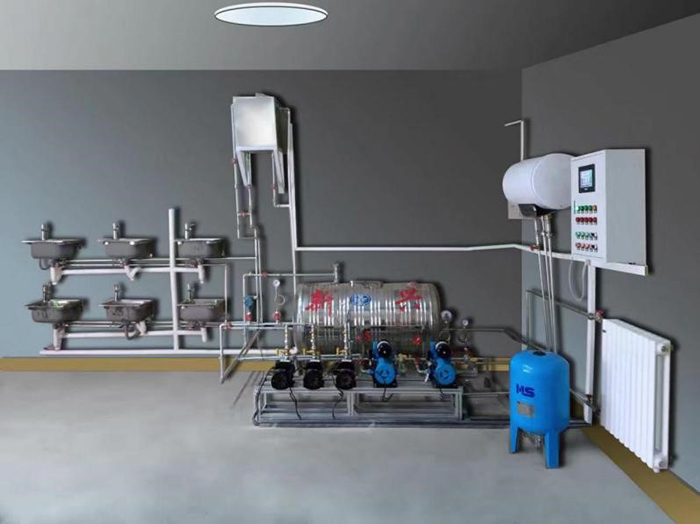 1、生活給水系統(tǒng):主要有給水箱、給水泵、給水管道、壓力變送器、脈沖水表、水龍頭和淋浴頭等組成。管路采用不銹鋼管進(jìn)行設(shè)計(jì),可進(jìn)行不銹鋼管的切割、安裝和通水試驗(yàn)操作,通過控制系統(tǒng)可實(shí)現(xiàn)生活給水系統(tǒng)的變頻恒壓供水功能,實(shí)現(xiàn)單泵變頻控制或雙泵切換控制等功能;通過脈沖式水表可以完成用水量的計(jì)量。