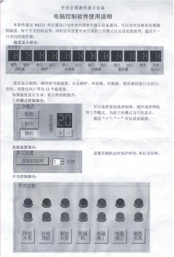 為了更好地滿足各大院校的教學(xué)需要,在原來開發(fā)的中央空調(diào)實(shí)驗(yàn)設(shè)備的基礎(chǔ)上,配備了RS-232串行通訊接口,可直接與電腦連接,由電腦控制軟件控制整個(gè)實(shí)驗(yàn)臺(tái)的運(yùn)行,包括:總控臺(tái)啟動(dòng)、制冷、制熱、冷卻水泵、冷卻風(fēng)機(jī)、制冷水泵、壓縮機(jī)、電磁閥、制熱水泵做演示,制冷、制熱的溫度設(shè)定等。