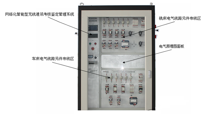 技能實訓考核柜 四個機床操作按鈕及機床指示區(qū)面板 四個機床電氣線路元器件布線區(qū) 兩個機床轉(zhuǎn)接模塊區(qū) 網(wǎng)絡(luò)化智能型機床實訓考核鑒定管理系統(tǒng) |
