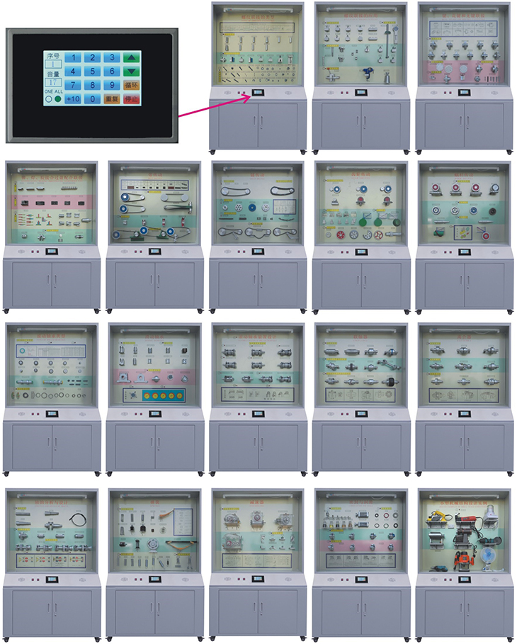 機械設計零件陳列柜,是根據機械設計(零件)課程基本要求設計制造的實驗設備。陳列柜通過機械零件模型或實物,配合相應的圖文資料,形象地展示與解說機械設計的基本知識,加強學生對通用機械零件的類型、結構特點及其設計的感性認知,為進一步學習機械設計奠定基礎。