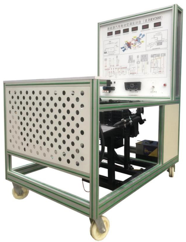 點(diǎn)火開(kāi)關(guān)、電動(dòng)汽車(chē)空調(diào)壓縮機(jī)、膨脹閥總成、干燥器總成、鼓風(fēng)機(jī)總成、冷凝器、冷卻電子風(fēng)扇、電動(dòng)空調(diào)壓縮機(jī)控制器總成、空調(diào)蒸發(fā)箱總成、充電器與充電接口、充電插線(xiàn)、DC-DC轉(zhuǎn)換器、鋰電池組、空調(diào)操作面板、高低壓空調(diào)壓力表、采暖模塊總成、電源總開(kāi)關(guān)、急停開(kāi)關(guān)、直流接觸器、輔助蓄電池(12V45AH)、一體化全鋁合金型材搭建的移動(dòng)臺(tái)架(1500×1000×1700mm ,帶自鎖腳輪裝置,帶安裝檢測(cè)端子的原理面板948×898mm)、故障模擬與排除裝置、設(shè)備操作說(shuō)明書(shū)。