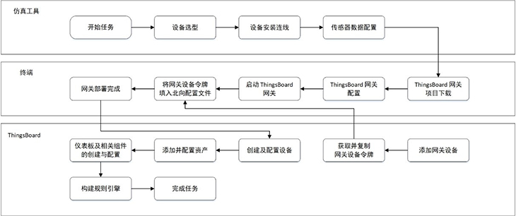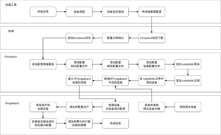 模擬智慧牧場系統(tǒng)還引入使用開源軟件平臺ChirpStack與ThingsBoard,結(jié)合LPWAN技術(shù),實現(xiàn)遠程低功耗數(shù)據(jù)采集、上報和展示。在ChirpStack平臺上,用戶可對網(wǎng)關(guān)、GPS、溫濕度傳感器等設(shè)備進行配置,以上送仿真實驗中的虛擬數(shù)據(jù)。在ThingsBoard平臺上,設(shè)置牧場地圖、告警信息、溫濕度等各儀表盤組件;獲取仿真設(shè)備上送的數(shù)據(jù),并將數(shù)據(jù)以圖表形式作可視化呈現(xiàn);以及基于流式編程添加相應(yīng)的規(guī)則策略,最終完成模擬智慧牧場實訓場景的部署搭建。