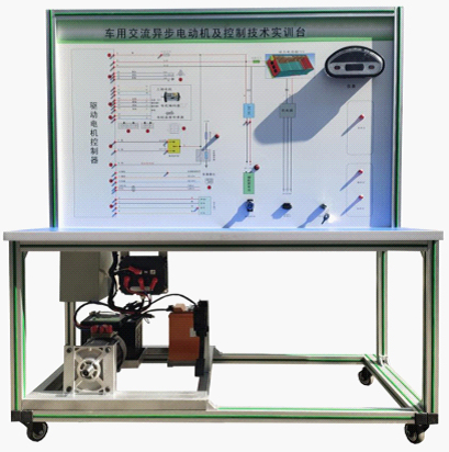 檢測控制面板(裝有各種檢測端子,1448×940mm彩色電路圖和工作原理示意圖)、組合儀表、點(diǎn)火開關(guān)、電機(jī)控制器、車載充電器與充電接口、DC-DC轉(zhuǎn)換器、鋰動(dòng)力電池組、電動(dòng)車電機(jī)(交流異步電動(dòng)機(jī))、剎車開關(guān)、檔位開關(guān)、油門控制裝置、大電流繼電器、電源總開關(guān)、急停開關(guān)、輔助蓄電池(12V45AH)、一體化全鋁合金型材搭建的移動(dòng)臺架(1500×700×1700mm (帶自鎖腳輪裝置,帶安裝檢測端子的原理面板,面板1448×940mm)、設(shè)備操作說明書。