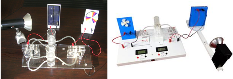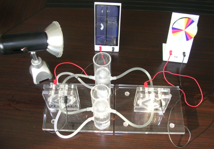 燃料電池教具是利用光線照射在太陽能電池板上產(chǎn)生電能,然后利用產(chǎn)生的電能作用在電解電池模塊上,使水發(fā)生電解產(chǎn)生氫氣和氧氣。氫氣和氧氣進(jìn)入到發(fā)電模塊產(chǎn)生電能,帶動(dòng)風(fēng)扇轉(zhuǎn)動(dòng)。