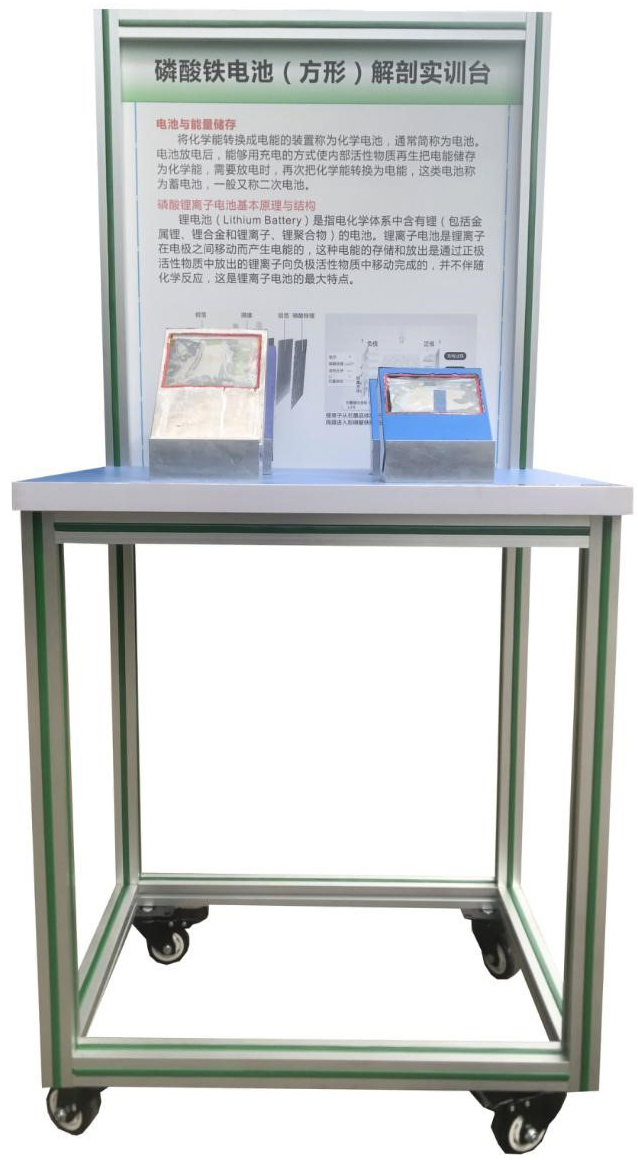 磷酸鐵鋰動(dòng)力電池3.2V20AH(兩件,其中一件解剖),酸鐵鋰動(dòng)力電池3.2V50AH(兩件,其中一件解剖),單體電池充電裝置,可移動(dòng)平臺和教板。