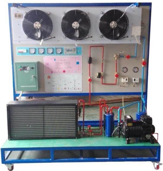 工業(yè)制冷系統(tǒng)實(shí)訓(xùn)考核裝置主要由半封閉式制冷壓縮機(jī)、冷凝器、蒸發(fā)器、膨脹閥和故障設(shè)置開關(guān)、測(cè)試儀表等組成。實(shí)訓(xùn)臺(tái)通過(guò)手閥開關(guān)和鈕子開關(guān)分別來(lái)設(shè)置管路系統(tǒng)和電控系統(tǒng)的 20 多種故障。設(shè)備采用先進(jìn)的電控系統(tǒng)并具有具有開相,缺相, 過(guò)流等保護(hù)功能。蒸發(fā)器風(fēng)扇采用變頻器控制速度。配備 8 路溫度計(jì),電壓表,電流表,功率表,功率因數(shù)表和壓力表,能實(shí)時(shí)觀察運(yùn)行參數(shù)
