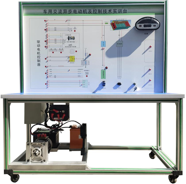檢測(cè)控制面板(裝有各種檢測(cè)端子,1448×940mm彩色電路圖和工作原理示意圖)、組合儀表、點(diǎn)火開(kāi)關(guān)、電機(jī)控制器、車(chē)載充電器與充電接口、DC-DC轉(zhuǎn)換器、鋰動(dòng)力電池組、電動(dòng)車(chē)電機(jī)(交流異步電動(dòng)機(jī))、剎車(chē)開(kāi)關(guān)、檔位開(kāi)關(guān)、油門(mén)控制裝置、大電流繼電器、電源總開(kāi)關(guān)、急停開(kāi)關(guān)、輔助蓄電池(12V45AH)、一體化全鋁合金型材搭建的移動(dòng)臺(tái)架(1500×700×1700mm (帶自鎖腳輪裝置,帶安裝檢測(cè)端子的原理面板,面板1448×940mm)、設(shè)備操作說(shuō)明書(shū)。